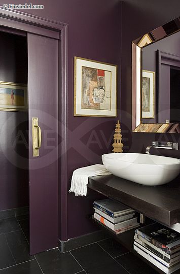 Guest cloakroom in Madrid apartment of interior designer Pedro de Azambuja painted in 'Aubergine' by Papers & Paint, London with beveled 1940s two-tone mirror