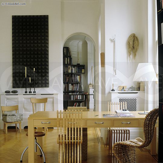 Ron Arad slatted 'Schizzo' chairs and a woven Tom Dixon 'S' chair, to the left Sachs' 'Chip on the Shoulder' chair. Interior design by Rolf Sachs