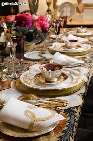 Place setting with antique textile cloths from Isfahan. China is a mix of pieces from Crate and Barrell USA, Aspeys in London and Thomas Goode in London. Cutlery is from Mappin & Webb