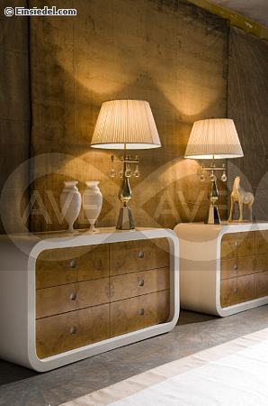 Pair of opaline glass vases with Tommy Parzinger lamps and a Tang dynasty horse on American white lacquer and buff veneer chest of drawers