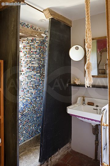 Unusual bathroom with a mosaic tiled shower unit with stone trough as a shower tray