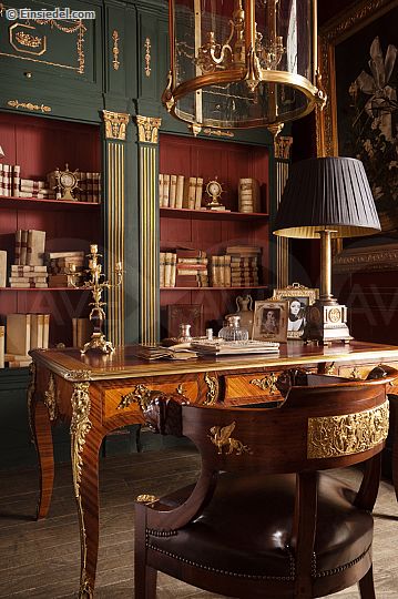 French Louis XV style ormolu mounted tulipwood and mahogany bureau plat / writing table with French Napoleon III mahogany lion head desk chair with neoclassical bronze mounts
