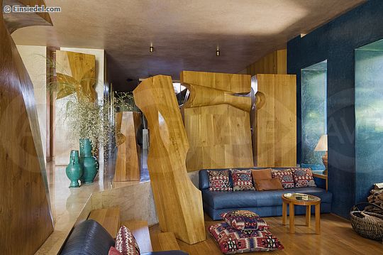 Large oak sculptures by French artist Olivier Serguin surround a sunken living room with leather sofas, moroccan cushions and tadelakt wall finish