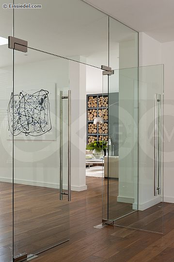 Glass wall and door with view through to hall. The painting is by Jemima Withey