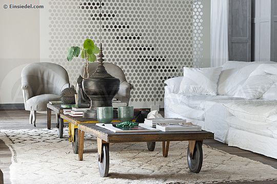 Old luggage trolleys provide perfect coffee tables in living area of open plan apartment. The rug is Moroccan and the sofa designed by Paola Navone