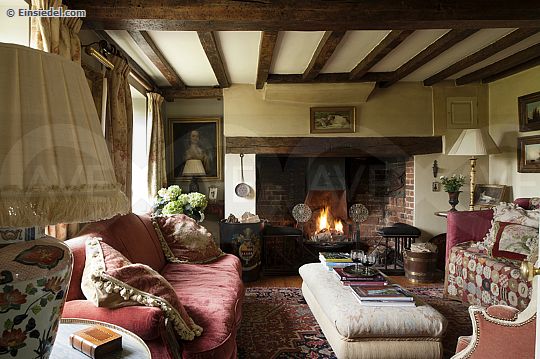 Inglenook fireplace in cosy sitting room with original beamed ceiling and red sofa