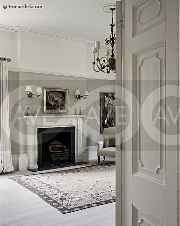 View through a panelled door into elegant bedroom painted in Pale Walnut by Dulux with an Aubusson rug and fireplace