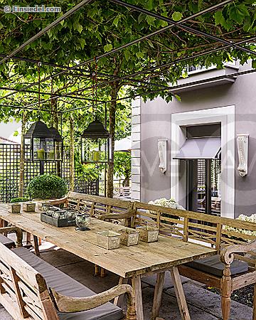 Long wooden table and wooden benches underneath pergola in raised terrace with potted box hedge and paving slabs