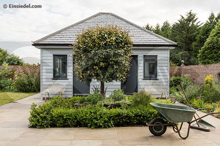 Wheelbarrow and gardening tools with exterior weatherboard painted in grey to blend to natural landscape