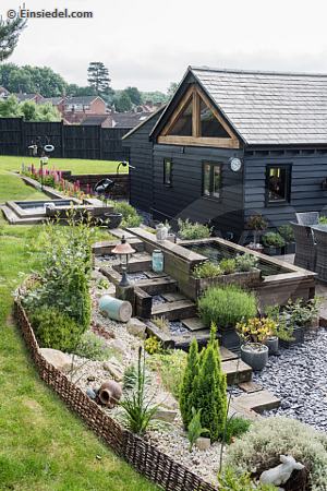 Neat terraced garden with garden pond