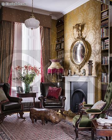 Gilded regency convex eagle mirror hangs above reinstalled regency chimney piece in drawing room with 1960s leather rhino from Liberty and French ebonised chair upholstered in green velvet.