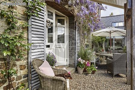Vintage French shutters and wisteria with wicker dining chairs