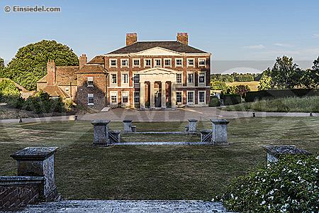 Terraced steps and lawn with Palladian brick facade of 18th century Goodnestone mansion