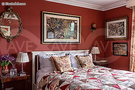 Framed prints and vintage mirror hang in guest bedroom of late 19th century West London home.
