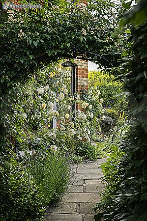 Climbing roses and archway over path outside Wimbledon garden, south-west London, England, UK.